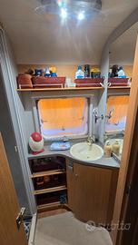 Caravan ideale per campeggio stanziale grazie alle dimensioni generose e alla larghezza di 248 cm, ma ottima anche per campeggio itinerante grazie allo stabilizzatore, alla carreggiata larga e alla distribuzione dei pesi. Dimensioni e pesi: lunghezza con timone 754 cm, larghezza 248 cm peso max omologato 1320 kg. 5/6 posti letto cosi disposti: matrimoniale con rete a doghe anteriore, castello con reti a doghe longitudinale e dinette centrale trasformabile in matrimoniale. Grande toilette con antibagno e doccia separata. Gavoni accessibili dall'interno e dall'esterno sotto letto matrimoniale e sotto letto a castello. Stufa Truma 5000 a ventilazione forzata. WC Thetford con cassetta estraibile dall'esterno. Boiler acqua calda TrumaTherme 5 litri elettrico. Frigorifero trivalente (gas, 220 V, 12 V) Fornello 3 fuochi (nuovo, mai usato) Maxi oblò Heki II. Serbatoio acque chiare fisso da 43 litri. Tutte le finestre con oscuranti e zanzariere. Zanzariera scorrevole sulla porta di ingresso. Antenna TV con presa interna ed esterna. Stabilizzatore Alko AKS 2004 confort. Piedini di stazionamento rinforzati. Porta biciclette 2 posti sul timone. Veranda Eurotenda mod. Modula profondità 3 mt fuori tutto, con pali diametro 28 in alluminio e annesso cucinotto con divisorio. Ogni pannello con porte zanzariere e finestre può essere spostato secondo necessità del momento.