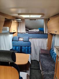 CAMPER MANSARDATO USATO KNAUS SUN TRAVELLER – 05 POSTI LETTO 06 POSTI VIAGGIO SU FIAT DUCATO 2.8 JTD 146 CV – CAMBIO MANUALE 5 MARCE – TRAZIONE ANTERIORE TELAIO AL-KO CON DOPPIO PAVIMENTO IMMATRICOLAZIONE: 05 / 2006 KM PERCORSI: 57936 Dimensioni e caratteristiche tecniche: Lunghezza: mt 6,28 Larghezza: mt 2,30 Altezza: mt 3,10 Massa complessiva: 3.500 kg Massa rimorchiabile: 2.000 kg Letto matrimoniale trasversale in mansarda – Dinette contrapposta lato SX trasformabile in letto matrimoniale – Divanetto lato DX – Cucina lineare 3 fuochi con Frigorifero trivalente 150 lt alto con cella freezer separata – Bagno con box doccia girevole e finestra Caratteristiche: Doppio pavimento passante Frigorifero trivalente lt 150 A Cucina 03 fuochi Zanzariera porta cellula Tenda separazione cabina / cellula Luce esterna Riscaldamento Truma Combi Serbatoio acque chiare 120 lt – grigie 110 lt Scarico wc a cassetta Doppia cassetta wc Dotazioni veicolo: Climatizzatore cabina Radio Retrocamera posteriore Vetri e specchietti elettrici Doppio airbag Pneumatici da 15” Michelin cross climate camping montati a novembre 2025 Ruota di scorta Tappetino zona guida nuovo Controllo sigillature e infiltrazioni effettuati in dicembre 2025 Controllo tenuta impianto a gas in dicembre 2025 Batteria motore sostituita in dicembre 2025 Optional inclusi: Antenna terrestre Tendalino Stacca-batteria di servizio Scaletta esterna Porta bici da 02 posti Ventole frigorifero Piedini di stazionamento manuali Copertura termica per parabrezza e cofano