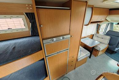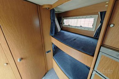 Motorhome con letto matrimoniale basculante nella zona anteriore, doppia dinette, cucina a L con frigo 150 l e bagno con cabina doccia affiancato da letti singoli a castello longitudinali con sottostante gavone di carico.