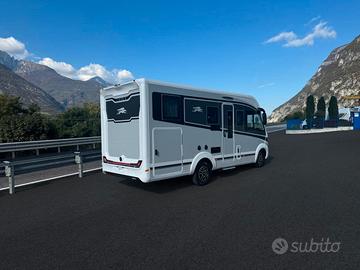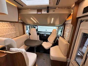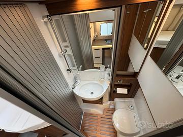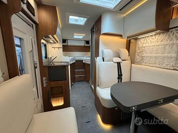 Letto basculante completamente integrato nella linea dei pensili, completo di rete a doghe, materasso di alta qualità, tenda perimetrale di cortesia, luci di lettura orientabili, prese USB, oblò a tetto, vano di stivaggio dedicato, riscaldamento