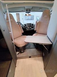 In viaggio, il Kosmo L 105 offre quattro posti omologati: oltre che in cabina di guida, infatti, due passeggeri possono trovare posto nel panoramico salotto posteriore, con il divano che offre poggiatesta e cinture di sicurezza a tre punti.