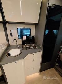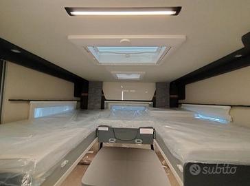 Diverse, invece, le possibilità offerte in configurazione notturna: i letti gemelli basculanti posteriori, a movimentazione elettrica, offrono due letti singoli di ampie dimensioni (lunghezza fino a 205 cm) e possono essere uniti e, grazie alla rete a doghe scorrevole e all'utilizzo di un cuscino aggiuntivo, creare un maxi matrimoniale da ben 205/190×200 cm da poter sfruttare in entrambi i sensi.