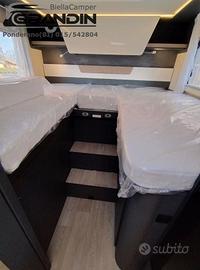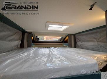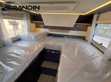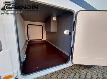 Letto basculante in dinette e letti gemelli in coda con ampio garage portamoto.