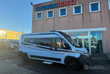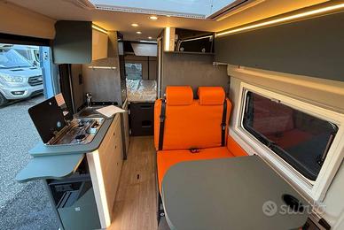 Van con letto matrimoniale trasversale in coda, bagno con doccia, cucina con frigo a compressore 84 l, semidinette con sedili anteriori girevoli.