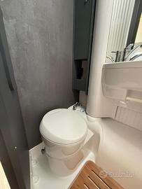 Pacchetto comfort: Pedana in legno per la doccia, moquette cabina guida, cappa aspirante in cucina, serbatoio di recupero coibentato e riscaldato, cupolino con skyview integrato apribile, cestelli e porta bottiglie estraibili in cucina, porta cellula Premium XL con chiusura centralizzata con telecomando, finestra, oscurante, vani di stivaggio e pistone a gas, predisposizione telecamera retromarcia, fodere cabina coordinate con il soggiorno