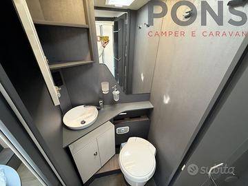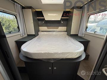 In coda trovi una vera camera matrimoniale con letto centrale, armadi e pensili, mentre il letto basculante elettrico sopra la dinette offre altri due posti letto pronti in pochi secondi.