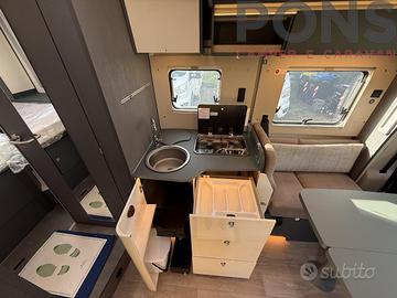 All'ingresso trovi un ampio soggiorno con doppia seduta contrapposta e tavolo centrale regolabile e ribaltabile: un vero salotto, luminosissimo grazie al grande skyroof e alle finestre laterali e a una completa illuminazione full Led. Sedili cabina girevoli e arredi moderni nei toni grigio/tortora, con la tappezzeria Siena e i cuscini Liguria che rendono l'ambiente caldo e accogliente.