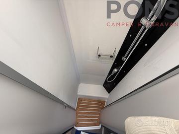 Il blocco toilette è elegante e pratico, con wc, lavabo e numerosi vani portaoggetti; di fronte la doccia indipendente con colonna e pedana in legno garantisce il comfort di casa anche in viaggio.