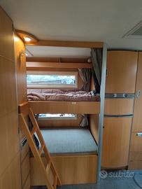 È composto da doppia dinette trasformabile ,frigo grande automatico ,letto matrimoniale in mansarda,due lettini posteriori laterali,bagno con box doccia separato.