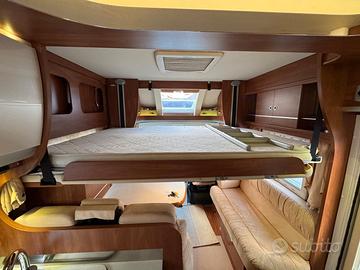 Veicolo di fascia alta con doppio pavimento e serbatoi isolati, offre una grande mansarda, letto matrimoniale in coda con garage per stivaggio, bagno con doccia separata e doppio ingresso e un'ampia dinette.