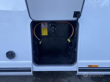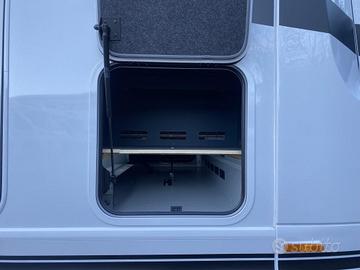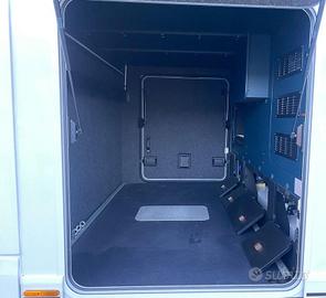 La parte esterna offre un grande garage posteriore con doppio portellone; doppio pavimento passante riscaldato, grazie all'impianto Alde, raggiungibile dall'esterno e dall'interno del veicolo con botole di accesso; carrozzeria priva di legno con tetto e sottopavimento in vetroresina;