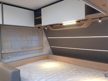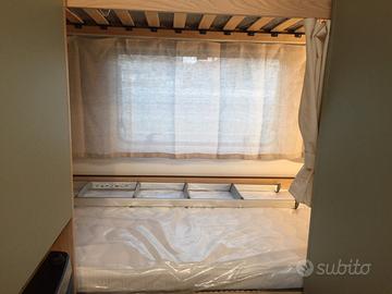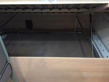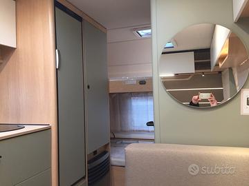 Bellissima caravan con ingresso anteriore ideale per la famiglia. A destra il grande letto matrimoniale con contenitore accessibile anche dall'esterno. Al centro è posizionata la dinette, il blocco cucina dotato di frigorifero a compressore cassetti estraibili e pensili. Fronte cucina il locale toilette completo di doccia. Due grandi letti a castello posteriore completano la pianta.