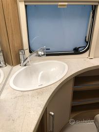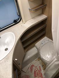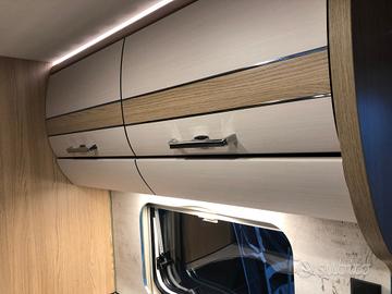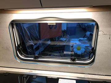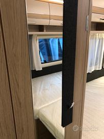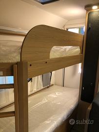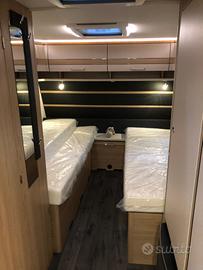 CARAVAN DI FASCIA ALTISSIMA DI GRANDI DIMENSIONI COMPOSTA DA LETTI GEMELLI TRASFORMABILI IN MAXI MATRIMONIALE , DINETTE A U TRASFORMABILE E ALLARGABILE A 140 CM E LETTI A CASTELLO IN CODA CON PORTELLO DI ACCESSO , TETTO FRONTALE E CODA IN VETRORESINA ANTI GRANDINE