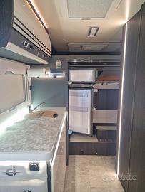 Doppio pavimento (caldo in inverno), letto matrimoniale basculante elettrico sopra la dinette e letto matrimoniale trasversale in coda regolabile in altezza, un letto si ricava abbassando il tavolo.
