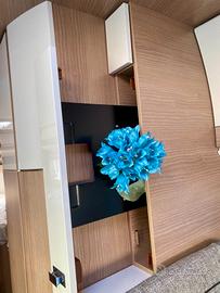Pacchetto comfort: tendina plissettata con struttura ad alveoli con azionamento verticale e tendine plissettati sui finestrini laterali , pannello comandi digitale Truma CP Plus, predisposizione retrocamera (per camera lente singola), predisposizione TV, predisposizione impianto satellitare, oblò midi heki sopra il gruppo seduta a L, porta cellula XL con doppia chiusura finestra e zanzariera avvolgibile, presa Usb nel pensile sopra il letto posteriore, illuminazione diffusa indiretta abitacolo e cucina con tecnologia LED, grande porta del garage lato guidatore, luci posteriori Malibu con strisce LED, predisposizione dell'impianto solare aerazione toilette SOG tramite camino sul tetto, set tubi per acque reflue per un comodo smaltimento,