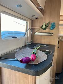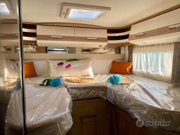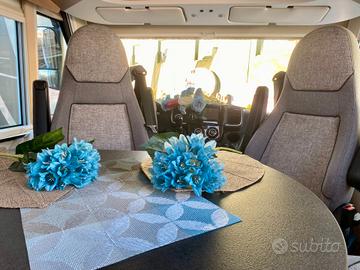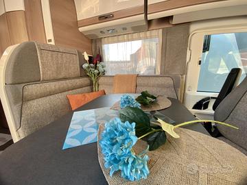 Pacchetto comfort: tendina plissettata con struttura adalveoli con azionamento verticale e tendine plissettati sui finestrini laterali, pannello comandi digitale Truma CP Plus, predisposizione retrocamera (percamera lente singola), predisposizione TV, predisposizione impiantosatellitare, oblò midi heki sopra il gruppo seduta a L, porta cellula XL condoppia chiusura finestra e zanzariera avvolgibile, presa Usb nel pensile soprail letto posteriore, illuminazione diffusa indiretta abitacolo e cucina con tecnologiaLED, grande porta del garage lato guidatore, luci posteriori Malibu con strisceLED, predisposizione dell'impianto solare aerazione toilette SOG tramite caminosul tetto, set tubi per acque reflue per un comodo smaltimento,
