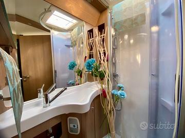 Motore: Fiat Ducato 2.2 180 CV CAMBIO AUTOMATICO Omologazione: 4 Posti letto: 4 Lunghezza: 6.95 Altezza: 2.94 Dotazioni: Pacchetto cellula: mascherina nero lucido, predisposizione radio con antenna sul tetto e DAB+ autoparlante(4x) ricezione DVB- T2, abbellimento del cruscotto con griglie di ventilazione cromate, superfici delle sedute nella cabina guida regolabili in inclinazione e in altezza, booster di ricarica, specchietti stile bus ''Malibu best view'' bicolore nero/bianco regolabili elettricamente e riscaldabili, radio Pioneer 6,8 con DAB, Pacchetto comfort: tendina plissettata con struttura ad alveoli con azionamento verticale e tendine plissettati sui finestrini laterali , pannello comandi digitale Truma CP Plus, predisposizione retrocamera (per camera lente singola), predisposizione TV, predisposizione impianto satellitare, oblò midi heki sopra il gruppo seduta a L, porta cellula XL con doppia chiusura finestra e zanzariera avvolgibile, presa Usb nel pensile sopra il letto posteriore, illuminazione diffusa indiretta abitacolo e cucina con tecnologia LED, grande porta del garage lato guidatore, luci posteriori Malibu con strisce LED, predisposizione dell'impianto solare aerazione toilette SOG tramite camino sul tetto, set tubi per acque reflue per un comodo smaltimento, cerchi in lega da 16'', volante e pomello del cambio in pelle, volante multifunzione, chiusura centralizzata, serbatoio carburante da 60L, Stile Bellagio, combinazione tessuto London OFFERTA IMPERDIBILE