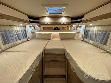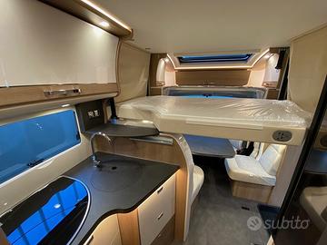 ACCESSORI: 216232 PACC TELAIO, 216260 PACC COMFORT, 216290 PACC TELAIO PLUS MANUALE, 216503 PACC PREDISPOSIZIONI, 810632 PACC COMFORT ABITATIVO, CHIUSURA CENTRALIZZATA, 410270 VANO DI CARICO NEL DOPPIO PAVIMENTO, 710501 Supporto a parete per TV 32" girevole a 180° nella zona d'ingresso, 810610 Massiccia porta scorrevole in legno davanti alla camera da letto, 810461 Letto basculante centrale sopra il gruppo sedute a L, 850324 Santorin - combinazione tessuto-Antara.