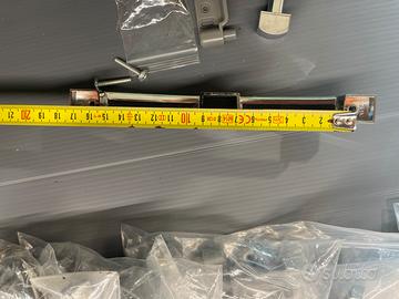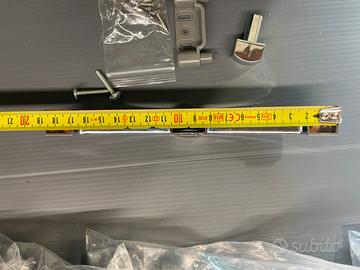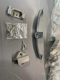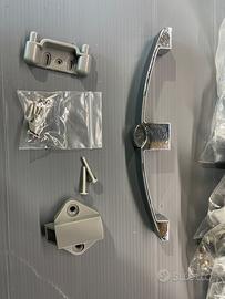 Maniglie per pensili e antine camper in platica cromate. Stock da 8 pezzi . Le maniglie sono usate e ben tenute. Sono complete di meccanismo di scrocco e viti, questi ultimi nuovi. Consigliate per sostituire maniglie rotte e per averne un po' di scorta. Dimensioni come da foto, lunghezza maniglia circa 187 mm e interasse dei fori per le viti mm. 160.