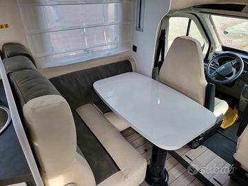 Semintegrale con letto basculante sotto i 7 metri con letto posteriore trasversale e ampia dinette a L con divanetto laterale.