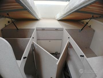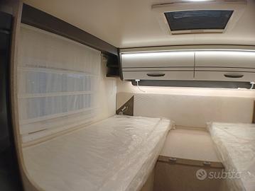 Dinette anteriore con tavolo abbattibile e trasformazione in letto, letto basculante matrimoniale anteriore e letti gemelli posteriori trasformabili in unico matrimoniale
