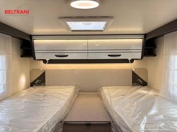 Nella parte posteriore si trovano i letti gemelli, comodi e facilmente unibili per ottenere un grande letto matrimoniale; una soluzione che offre versatilità sia alle coppie che alle famiglie. Il bagno è organizzato con doccia separata, garantendo privacy e comodità come a casa.
