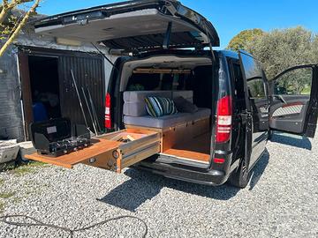 Mercedes Viano 3.0 Diesel Camperizzato – Ottime condizioni – 2013 Vendo splendido Mercedes Viano 3.0 diesel camperizzato, anno 2013, con 267.000 km, in ottime condizioni sia meccaniche che interne. Il mezzo è stato allestito con grande cura ed è perfetto per viaggi e avventure, pronto all’uso senza necessità di ulteriori lavori. Caratteristiche principali: Motore sempre tagliandato presso Mercedes Allestimento camper funzionale e ben organizzato Letto con doghe estraibili e materassi su misura realizzati da divanificio Cassettone estraibile con ampio vano contenitore Tavolo estraibile ideale per cucinare e mangiare Mobile dedicato porta frigo con tavolino interno integrato Ulteriori cassetti contenitori sia sotto che sopra il letto Guide in acciaio robuste e scorrevoli Pavimento in parquet di legno marino, resistente e confortevole Tende complete per copertura vetri + tenda oscurante su misura per separazione abitacolo Dotazioni aggiuntive: Batteria supplementare con illuminazione interna e prese per accessori Sedili anteriori in pelle Inclusi altri 5 sedili posteriori in pelle, in ottime condizioni e facilmente riposizionabili Connessione Bluetooth per telefono Supporti per telecamere Cerchi in lega da 18” Inclusi altri 2 cerchi nuovi, ancora imballati, uguali agli originali Veicolo ideale sia per uso quotidiano che per viaggi on the road, grazie alla sua versatilità e comodità. Contattami per maggiori informazioni/foto o per visionarlo.