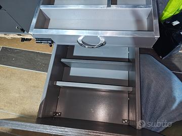 -cassetto estraibile con cisterna acqua da 25 LT collegata a pompa acqua 12v per rubinetto ad innesto comandato con tasto on/off; collegabile alla presa accendisigari.