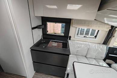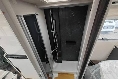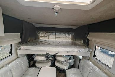 Motorhome con letto matrimoniale nel basculante, dinette face to face nella zona anteriore, cucina ad L e bagno con doccia completamente separata nella zona centrale e grande letto matrimoniale in stile nautico nella zona posteriore.