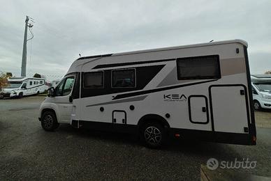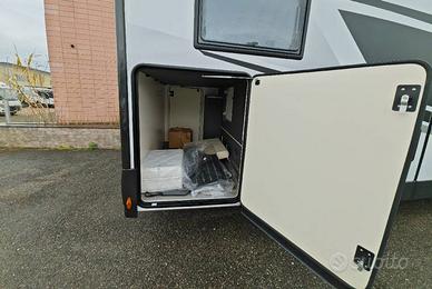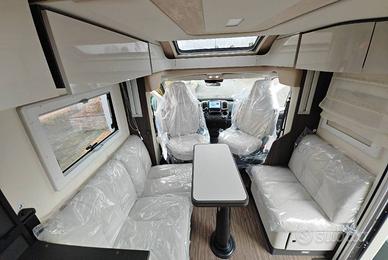 Semintegrale compatto con letti singoli gemelli e sottostante gavone garage nella zona posteriore, bagno con doccia e cucina con frigo 150 l a compressore nella zona centrale, dinette face to face con sedili anteriori girevoli e letto basculante matrimoniale.
