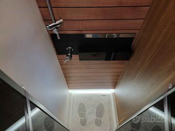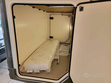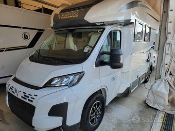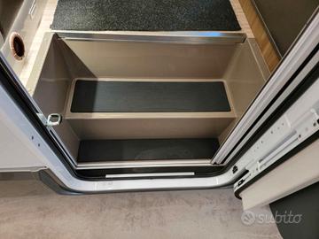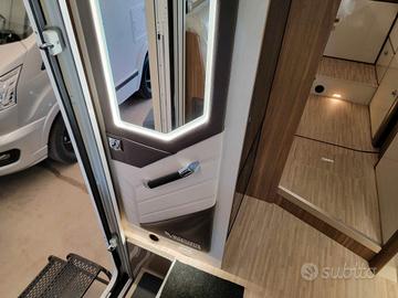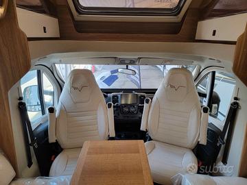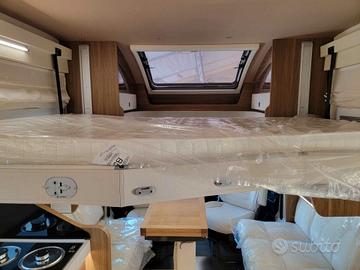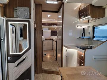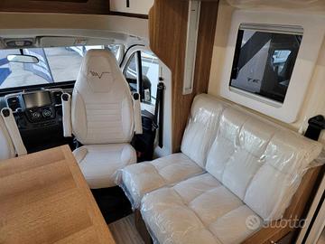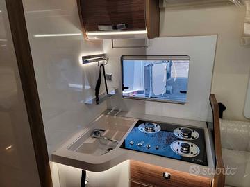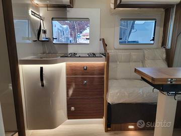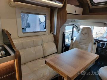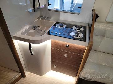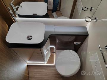 Comodità ed eleganzaLa zona giorno è spaziosa, elegante e funzionale, con un'altezza interna superiore ai due metri e tanta luminosità data dall'oblò e dalle due maxi finestre, entrambe dotate di oscurante. Un tavolo a libro in laminato legno teak, con gamba tavolo cromata e protezione in ecopelle per gustarsi i pasti. L'isolamento è garantito dal tetto soft touch.Alta cucina in camperTutto è portata di mano nel blocco cucina dotato di piano cottura in acciaio inox a tre fuochi lineari, con lavello incassato in acciaio inox specchiato, fornito di copri lavello diviso in due parti utilizzabile separatamente come portaoggetti o tagliere. La cucina è dotata di vascha porta oggetti, porta rotolo, porta asciughino e vano per macchina da caffè integrato nel portarotolo. Il piano in pietra acrilica a stampo monoblocco e copertura della finestra intermoformato è facile da pulire.Qualità e valoreToilette e doccia separati: utilizzabili contemporaneamente.Igiene: piano in laminato opaco antibatterico.Maxi portaoggetti, specchio a parete e su pensile, lavabo ampio.Piatto doccia, dimensioni maggiorate. In ABS rinforzato anti rottura.Luce a LED segnapassi, per muoversi di notte.Un esclusivo bagno di lusso, un ambiente dotato di comodità, in cui godere la tua igiene e cura personale quotidiana in un modo molto speciale.