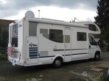 Mobilvetta Miller Alabama, Km. 26.000, omologato 5 posti viaggio, e 7 posti letto, unico proprietario, il camper è stato sempre rimessato al coperto è in perfette condizioni esterne ed interne vendo per problemi famigliari, compreso di tutto, parabola satellitare,2 Tv satellitari con cam e schewda Tvsat, tendalino mt.450 nuovo, pannello solare 120 watt, interno luci a led, tavolo in alluminio, 3 sedie, portabici da 3 bici, seconda vaschetta vc, roller tank da 40 litri, roller tanck da 20 litri nuova, kit con ruota di scorta, autoradio doppio din, 2 bombole gas da 10 litri, e molti altri accessori, volendo a parte anche copertura completa in tubo zincato da 60 millimetri tutta telonata, il camper è tagliandato e revisionato pronto per partire. Euro 39.900