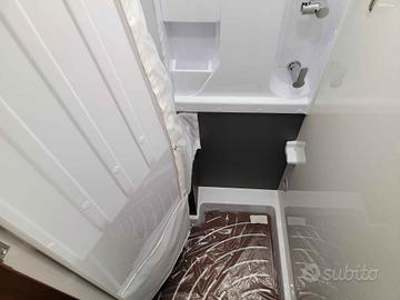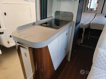 Il piano della cucina trasla per accedere al lavello integrato in pietra acrilica. Cestello laterale attrezzato con ripiani in acciaio inox e porta bottiglie. Accessibile da esterno e interno. 3 cestoni frontali a estrazione totale, chiusura automatica e blocco in viaggio. Spessore 14 mm, in multistrato.