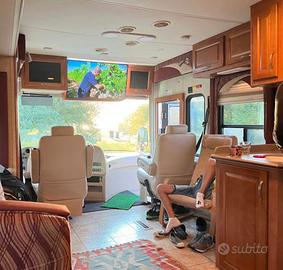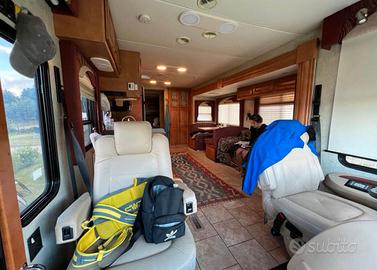 ACCESSORI: doppio tetto in vetroresina canalizzato con 2 condizionatori a pompa di calore da 13.5 Btu, Riscaldamento a pavimento con Stufe e boiler Atwood a gas, forno a microonde e frigorifero americano, home theater, predisposizione telefono e lavatrice, side Camera + Retro su schermo in console, Generatore Onan quiet diesel 8kw, sensori gas, Inverter 2kw, sterzo regolabile/telescopico, tende esterne su finestre+ tendalino elettrico su porta d'ingresso, serbatoi servizi riscaldabili, trombe clacson Hadley