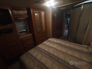 motorhome americano perfette condizioni dotato di 3 slide 2 clima cellula più guida piedini idraulici 2 riscaldamenti diesel/gpl motore ford V10 benzina impianto gpl con autonomia 550 km costo circa 100 euro gancio traino omologato 3500 kg wc nautico 160 l serbatoio acque chiare 300 l 2 tv antenna satellitare lunghezza 10 mt patente C no C1 4 posti viaggio e letto