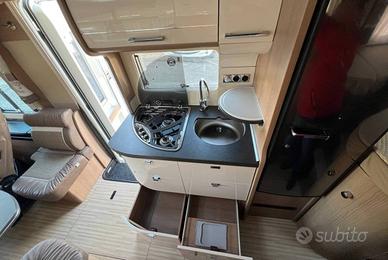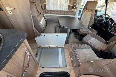 Motorhome con letti singoli gemelli nella zona posteriore, bagno con cabina doccia e cucina con frigo 145l nella parte centrale, dinette a L con divanetto singolo e sedili anteriori girevoli, letto basculante matrimoniale.