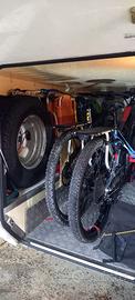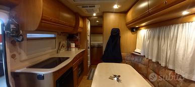 Motorhome 4 Posti (1 letto matrimoniale in coda e 1 basculante anteriore) garage grande, zona giorno con dinette grande e tavolo centrale living, zona cucina in linea, bagno e doccia
