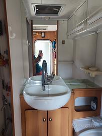 Accessori: Stufa Truma Combi Diesel e cellula con coibentazione invernale, Frigorifero Trivalente (gas, 220, 12 volt) con congelatore incorporato, Piano cottura a tre fuochi, Bagno con doccia separata + wc a cassetta, Zanzariera su porta e finestrini cellula, Ampia dimette con divanetto laterale, Portabici, Retrocamera, Gradino elettrico, Tendalino in veranda, Gavone laterale contenente 2 bombole, + VARIE Camper sempre tenuto a tetto. Prezzo trattabile Visionabile in loco. No perditempo Pronto all'uso, fatto check up in autunno al rientro da circa 3000 km percorsi senza problemi prima della pausa invernale. Vendo per cambio genere di camper essendo variate le esigenze.