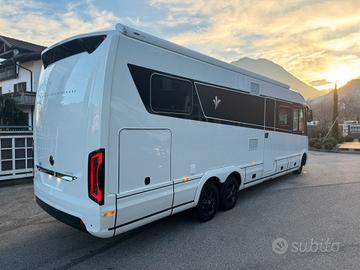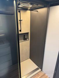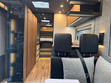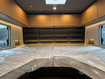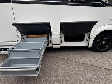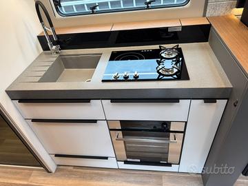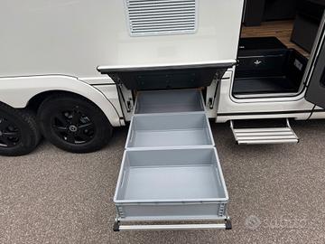 Veicolo nuovo Meccanica: Mercedes Sprinter Alimentazione: Diesel Lunghezza: 907 cm Larghezza: 240 cm Altezza: 303 cm Peso massimo: 5.500 kg (necessario patente C/C1) Posti omologati: 4 Posti letto: 4 Dotazioni del veicolo: ClouLine Design Cerchi in lega da 16" Design accentuato esterno Maxi "LookCarbonio" Design accentuato esterno "LookCarbonio" Decoro mobili e ante mobili pensili zona giorno, nottee cucina in "walnut planked" Frontali della cucina in "white planked" Tappezzeria pelle attraction Cuscini schienali Grand Cru N°7 Forno a gas nel blocco cucina Armadio con portavestiti e cassetti al posto del portapantaloni Parete posteriore nella zona notte in nero Pacchetto Lithium Energy Pacchetto Multimedia senza impianto satellitare Pacchetto di Guida Comfort Motore 170 CV Cambio automatico con convertitore dicoppia9G-tronic Sedili comfort per conducente e passeggero con riscaldamentodel sedile e supporto lombare Fari LED anabbaglianti a abbaglianti Fendinebbia a LED Carreggiata allargata asse anteriore Sensori di parcheggio posteriore Gavone esterno estraibile lato passeggero, anteriore Gavone esterno estraibile lato passeggero, posteriore Sistema di stivaggio nel doppio pavimento Veranda elettrica, 6,0 m Portellone garage lato conducente Letto basculante sopra cabina guida Divano lato conducente trasformabile (4 posti omologati) Cassetti cucina con divisori flessibili - Superficie in materiale minerale (cucina) - Doccia esterna all'interno del garage Tubo di scarico con custodia Presa gas esterna Truma DuoControl Serbatoio gas 50l/20kg con indicatore di livello WC nautico in ceramica con serbatoio da 170 l Areazione toilette SOG Scambiatore di calore Kit ampliamento per il riscaldamento ad acqua calda Scaldasalviette nel vano toilette Riscaldamento ad acqua calda ALDE Riscaldamento a pavimento Presa 230 V nel garage Chiusura centralizzata per porta cellula, porte garagee portelloni esterni
