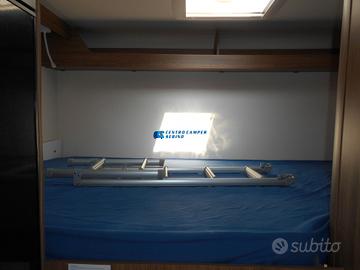 Alzando la rete inferiore del letto a castello è possibile avere un maxi garage avendo comunque 6 posti letto di cui 4 sempre pronti + letto matrimoniale in dinette.