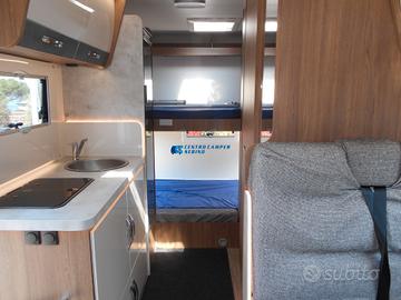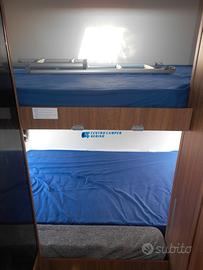 Camper mansardato 6,99 mt con 8 posti letto (6 posti letto sempre pronti tra cui letto matrimoniale in mansarda e letto a castello matrimoniale posteriore + letto matrimoniale ricavabile dalla dinette) e 6 posti viaggio omologati.