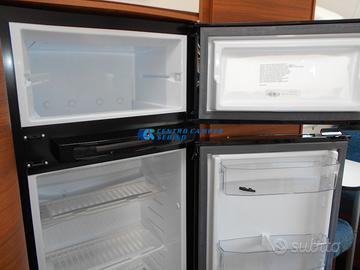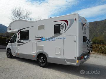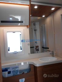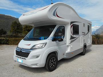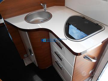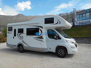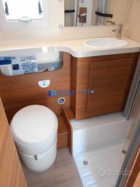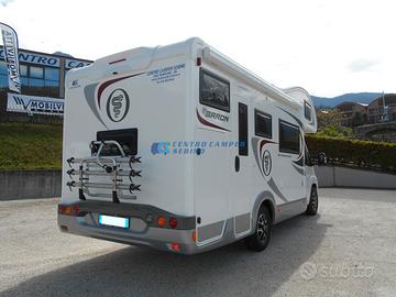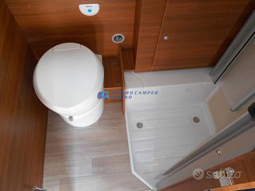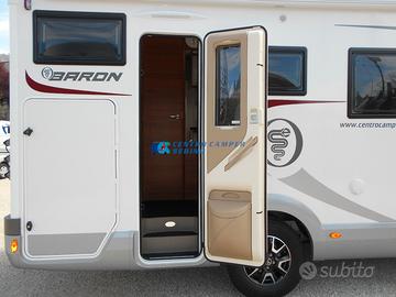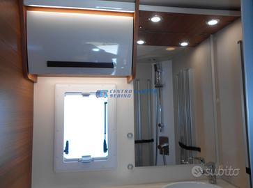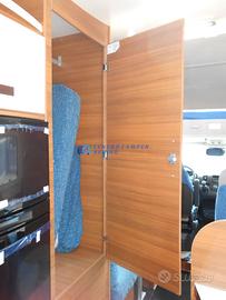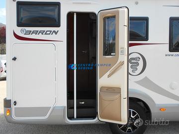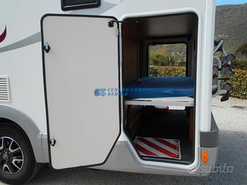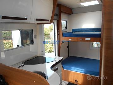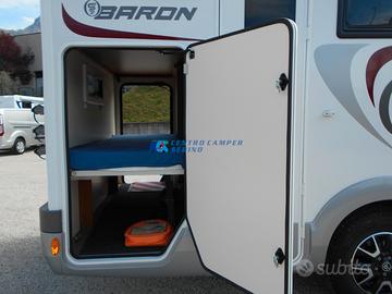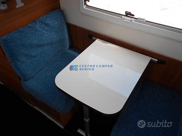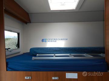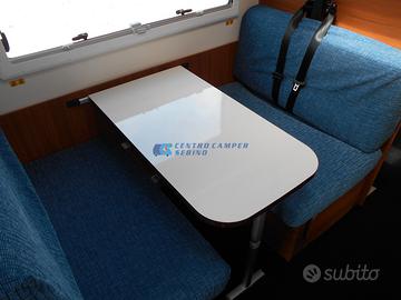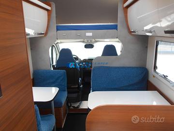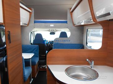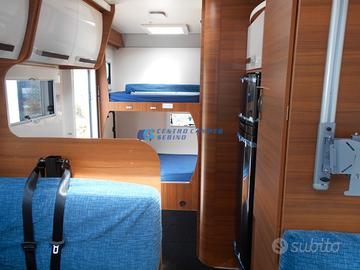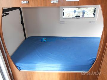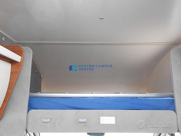 Elnagh Baron 22 camper mansardato con 7 posti letto e viaggio omologati, doppia dinette affiancata (doppio tavolino) e letti a castello trasversali (gavone a volume variabile, altezza massima 135 cm)