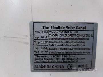 Vendo pannelli solari flessibili (peso circa 1,8 kg) da 100W, 12V (specifiche in foto), per camper, caravan, barche. Usati una sola estate, quelli aperti, quelli imballati sono nuovi. Vendo per vendita roulotte. Sono perfetti e possono essere testati con multimetro di persona prima della vendita. Vendo in blocco €. 200