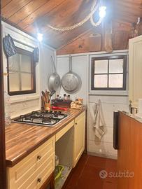 cucinotto attrezzato con fuochi piatti bicchieri e pentolame