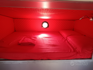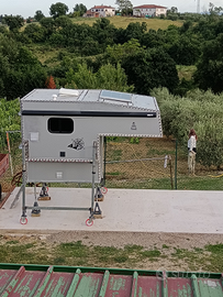 Pannelli in alluminio coibentato, condizionatore caldo/freddo, tendalino fiamma, turbo vent, 2 fuochi, frigo 55lt, hot spot chimico, doccia esterna, pompa acqua con serbatoio acciaio inox, pannello solare 100hp, caricabatterie e 2 batterie da 100ha, due posti letto +1, pannello comandi, prese 220 e 12V, luci led.