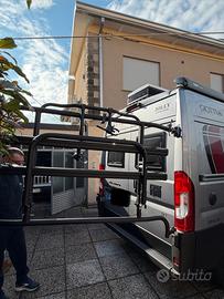 Vendo portabici nuovo, mai usato, per furgone camperizzato, carico max 60kg. Installazione sulle viti originali delle porte (no fori). Consente l'apertura delle porte battenti anche con bici caricate, apertura porte 90°. Completamente preassemblato, realizzato in alluminio verniciato peso 17 kg ca. Supporto telaio bici a fascia con cric, supporti ruota regolabili.