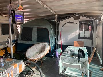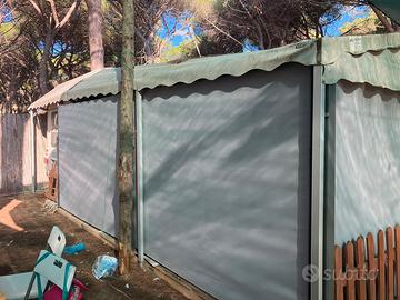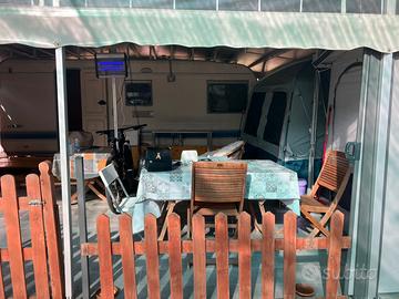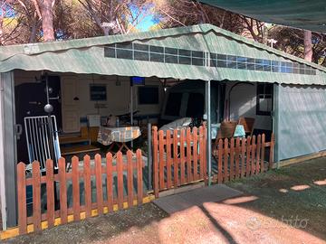 Vendesi postazione fissa con roulotte 5 posti letto interni , totale Esterno pavimentazione e copertura circa 65 mq con chiusure laterali Accessori -Aria condizionata interna - impianto elettrico nuovo - coperture laterali apribili - pavimentazione - cucinino - camera matrimoniale esterna Compreso di letto Presso Camping Pionieer Montalto Marina di castro
