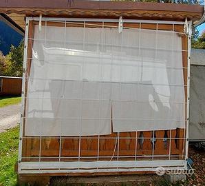 In vendita preingresso/casetta in legno con misure standard che rispetta tutte le normative per posizionarla nei campeggi. Misure lunghezza base d'appoggio: mt. 5,80 x 2,50. Il Tetto ha una misura di mt. 6,50 x (2,75-2,80) inclusa la canalina dell'acqua che si può togliere Casetta ben coibentata e isolata,ideale per la montagna,pronta da caricare sul Camion. Usata sempre in campeggio,in ottimo stato, veranda/terrazzino esterno con coperture per l'inverno in PVC trasparente e resistente sole/pioggia etc. Incluse panche interne al terrazzino e l'arredo completo del cucinino, forno a gas, armadietti vari, mensole, panche seduta con cuscineria Il lato che appoggia alla Roulotte,ha l'ingresso della porta alla Caravan verso sx guardando le foto frontalmente, zona posteriore rispetto al fianco della Roulotte e non anteriore Distanza dal posteriore della casetta a inizio foro apertura per entrare nella Roulotte, ci sono cm 70 e il foro apertura di entrata è di circa cm 100. Possibilità di trasporto ovunque in Italia,prevvio accordi, a carico vostro Prezzo 1600 Non trattabili Misure zona cucinino mt. 2,60x2,50 Misure zona terrazzino esterno mt. 3,20x2,50 Non curiosi Non perditempo, grazie