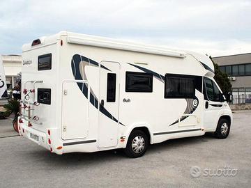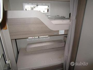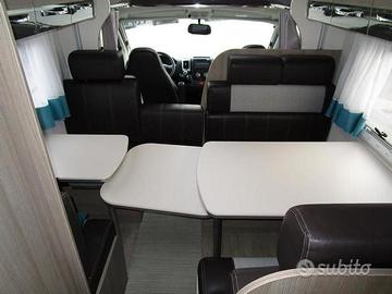 Bellissimo camper semintegrale Chausson Flash 656 su Fiat Ducato 2.3 Multijet 130cv del 2017 con appena 18.200 Km! Veicolo unico nel suo genere, lungo solo 6,96 m ed in ottime condizioni, con l'unicità di essere un profilato 5 posti omologati e 6 + 1 posti letto! Il veicolo infatti è dotato di un letto matrimoniale basculante, del letto a castello posteriore trasversale, trasformabili in garage, di una dinette classica trasformabile in matrimoniale e di una dinette singola utilizzabile anche come divanetto o letto per un bambino. Inoltre grazie a dei cuscini aggiuntivi, si possono unire le 2 dinette da un lato, per avere un maxi divano con tavoli adiacenti.
