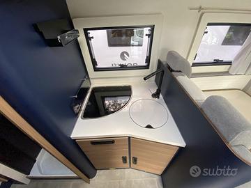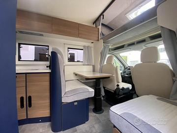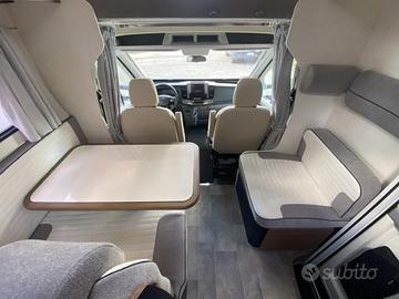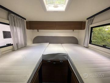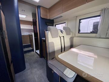 Disposto su una lunghezza di 7,30m, il veicolo è omologato 5 posti e dispone di 5 posti letto suddivisi in matrimoniale in mansarda, letti gemelli in coda e dinette trasformabile in letto.